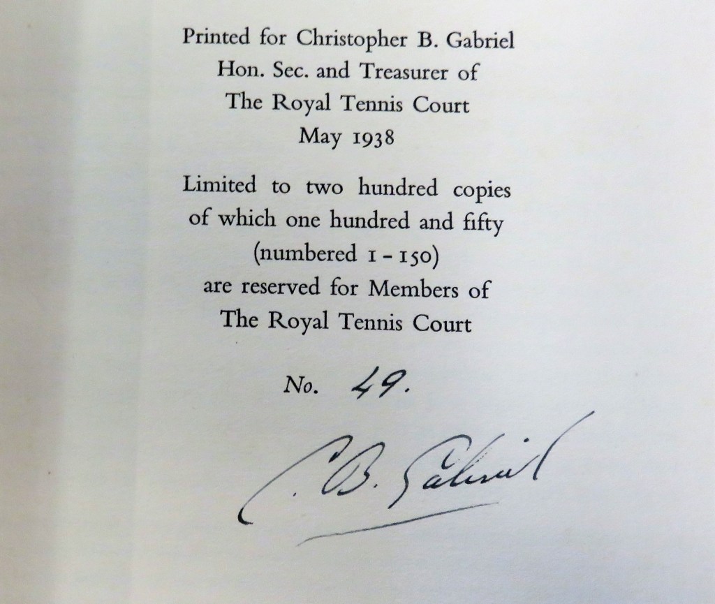 Translated into English by Catherine W. Leftwich. Originally published in French in 1767 and now translated into English for the first time. Printed for Christopher B. Gabriel Hon. Sec. and Treasurer of the Royal Tennis Court May 1938. Limited to 250 copies, of which 150 are reserved for members of The Royal Tennis Court. Numbered 49, and signed C.B. Gabriel. Original red cloth binding, a little discoloured. Gilt illustration to the front board and spine. Five plates bound to the rear, plus frontis. with original tissue guard. Endpapers a little foxed otherwise contents clean. Scarce. 45pp