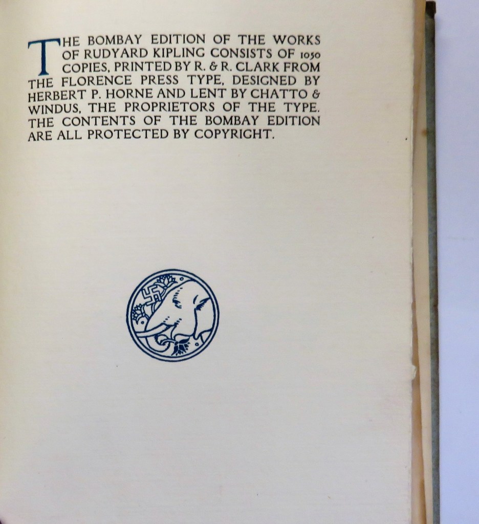 The Bombay Edition of the Works of Rudyard Kipling consists of 1050 copies, printed by R. & R. Clark from the Florence Press Type, Designed by Herbert P. Horne and Lent by Chatto & Windus, the proprietors of the type. The contents of the Bombay Edition are all protected by copyright. Hardback with cloth spine and paper boards Paste-down title band to spines. Top edge gilt to pages. Pages untrimmed. Volume I signed by author to half title. Covers rubbed and lightly toned with some small scuff marks. Prelims lightly to moderately foxed. Pages clean and bright if lightly toned. Vol I Plain Tales from the Hills 1886-1887 – 271 pp. Vol II Soldiers Three: The Story of the Gadsbys: In Black & White – 287 pp. Moderate to heavy foxing to front and rear pages, cracking to gutter. Vol III Wee Willie Winkie; Under the Deodars; The Phantom ‘Rickshaw and Other Stories – 301 pp. Less rubbed than the other volumes to cover. Light to moderate foxing to prelims. Vol IV From Sea to Sea and Other Sketches; Letters of Travel I – 356 pp. Title band moderately rubbed. Vol V From Sea to Sea and Other Sketches; Letters of Travel II – 346 pp. Vol VI Life’s Handicap Being Stories of Mine Own People – 329 pp. Vol VII The Light That Failed – 233 pp. Less foxed. Several scuff and soiled marks to front cover. Vol VIII The Naulahka A Story of West and East – 270 pp. Front cover lightly soiled. Vol IX Many Inventions – 314 pp. Light to moderate scuffing and soiling to cover. Chipping to title band slightly affecting the text. Vol X ‘Captains Courageous’ A Story of the Grand Banks – 172 pp. Less foxed and scuffed. Faded portions to title band not affecting text. Vol XI The Jungle Book 1914 – 175 pp. Much less foxing. Light scuffing to cover. Title band a little chipped not affecting the text. Vol XII The Second Jungle Book – 218 pp. Contains frayed ribbon marker. Light chipping to title band not affecting the text. Vol XIII The Day’s Work – 331 pp. Some scuffing to cover and chipping to title band not affecting text. Vol XIV Stalky & Co – 218 pp. Moderate foxing to rear pages. Toning to cover. Vol XV Kim – 332 pp. Contains frayed ribbon marker. Moderate toning and scuffing to cover. Vol XVI Just So Stories For Little Children Illustrated by the Author – 195 pp. Much less foxed. Some scuffing and toning to cover. Chipping to title band not affecting the text. Vol XVII Traffics and Discoveries – 336 pp. Moderate toning to cover. Vol XVIII Puck of Pook’s Hill 1905-1906 – 230 pp. Much less foxed. Cracking to gutter. Some toning to cover. Small mark to spine. Vol XIX Rewards and Fairies – 288 pp. Toning and scuffing to cover. Vol XX Actions and Reactions – 256 pp. Very little foxing. Light toning to cover. Vol XXI Departmental Ditties; Barrack-Room Ballads and Other Verses – 274 pp. Endpapers soiled. Cover quite bright. Vol XXII The Five Nations; The Seven Seas – 307 pp. Very little foxing. Some toning to cover. Vol XXIII Songs From Books 1915 – 262 pp. Title band a little scuffed. Vol XXIV A Diversity of Creatures 1917 – 357 pp. Cracking to gutter at rear. Vol XXV The Years Between; The Muse Among the Motors 1919 – 135 pp. Much less foxing. Cracking to gutter at rear. Overall good+ condition. Fabulous set – truly a collector’s set!
