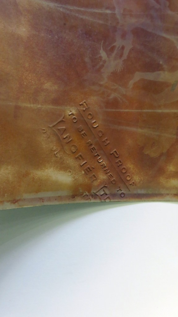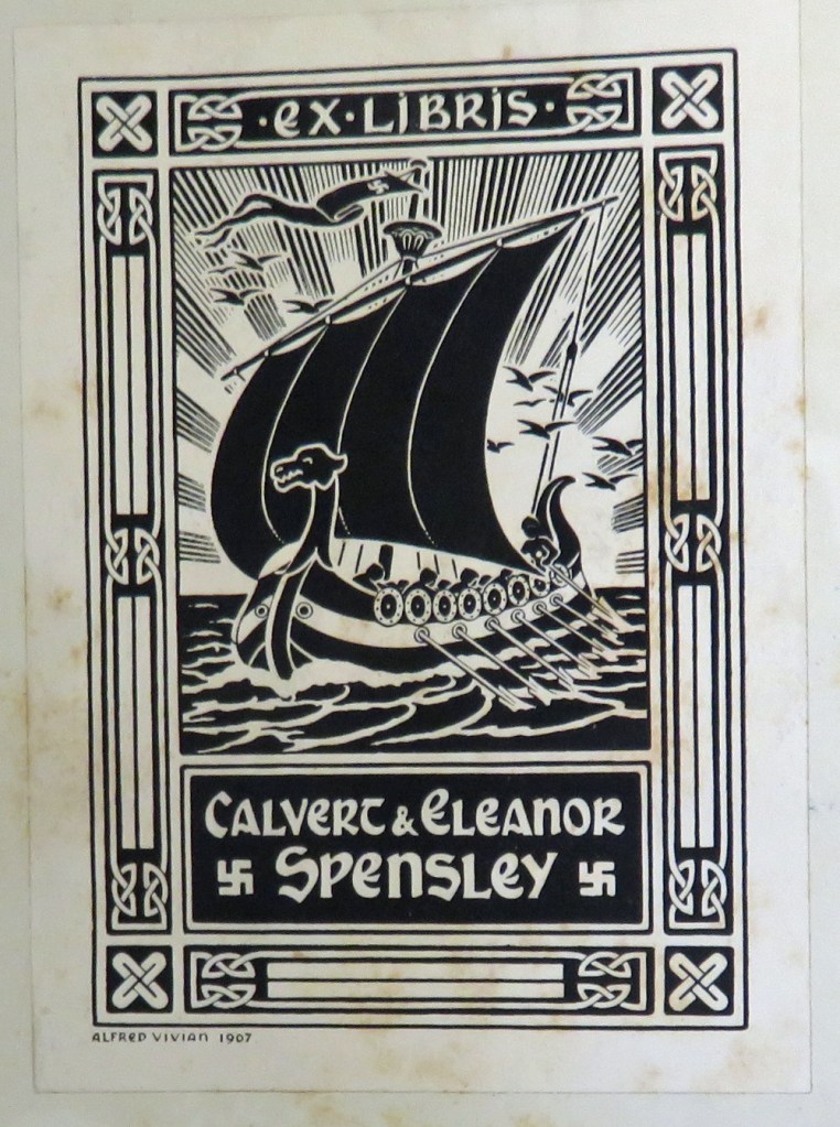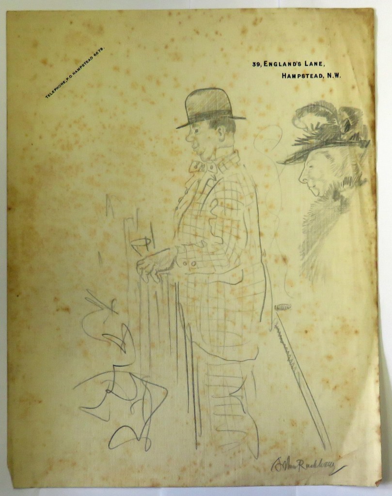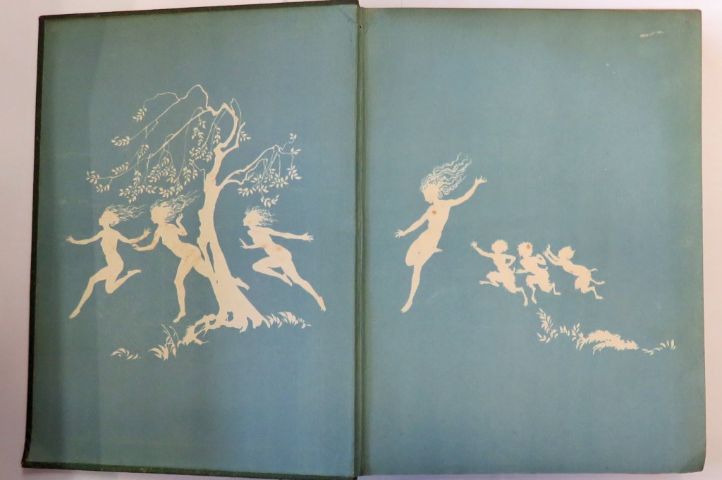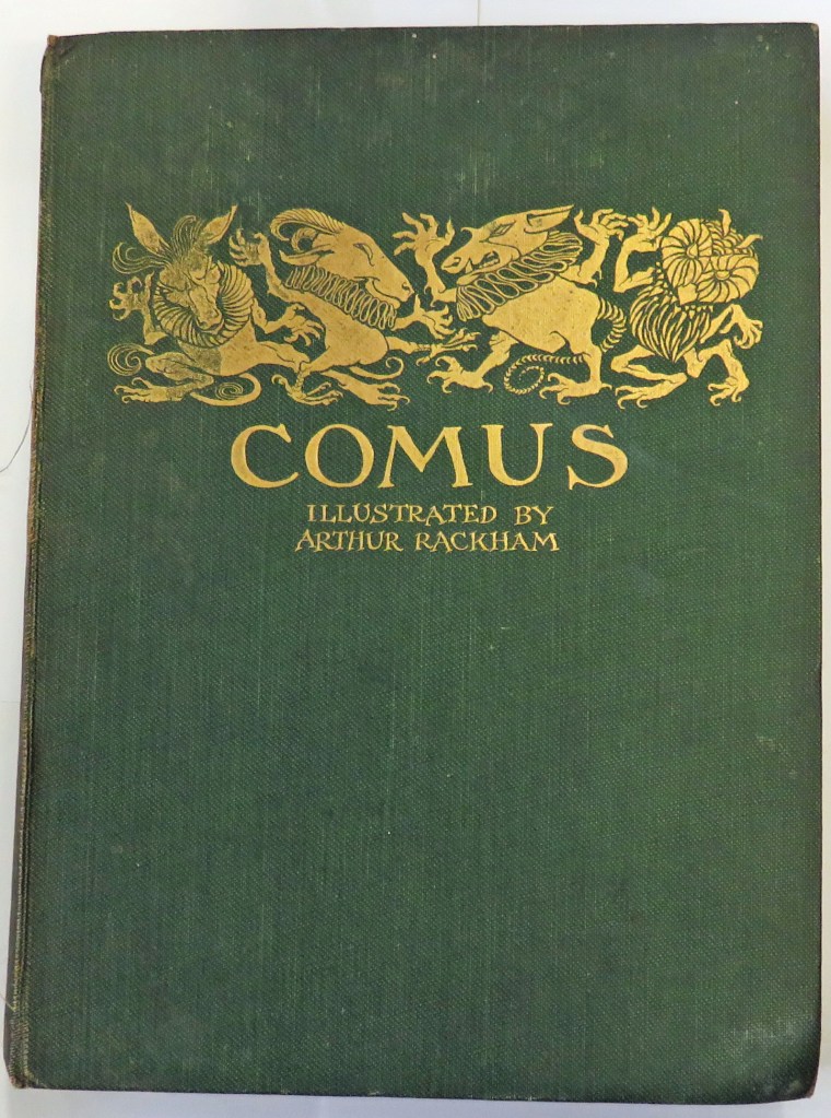 First edition of Comus by John Milton, undated (1921). Hardback clothbound with gilt tooled title and pictorial vignette to cover and to spine. Top edge of pages green. Pictorial endpapers. Ex Libris Calvert & Eleanor Spensley bookplate to fep. Original ink drawing to half title page of a goat-headed satyr in fashionable clothes, which is inscribed ‘To Mr Calvert Spensley / from Arthur Rackham / 15.11.21’. Full colour tipped in illustrated frontispiece with tissue guard. Printed quote to verso of tissue guard facing title page. Illustrated vignette to title page. Additional twenty one illustrations throughout, several full colour tipped in with tissue guard and the remainder within the text. Loose original pencil sketch signed Arthur Rackham on his headed notepaper of a man in a bowler hat and a woman in a feathered hat (? racecourse goers) tucked into the book. Together with three photographic ‘Rough Proofs’ for the Comus endpaper illustrations. A little rubbing to cover and split in cloth over hinge. Corners and spine edges a little bumped. Cracking to gutter. Light to moderate foxing and spotting to pages throughout, including loose sketch, although despite this the pages remain relatively clean and bright. Some tears and creases to the top of one of the photographic rough proofs. Binding nice and tight. 75 pp.