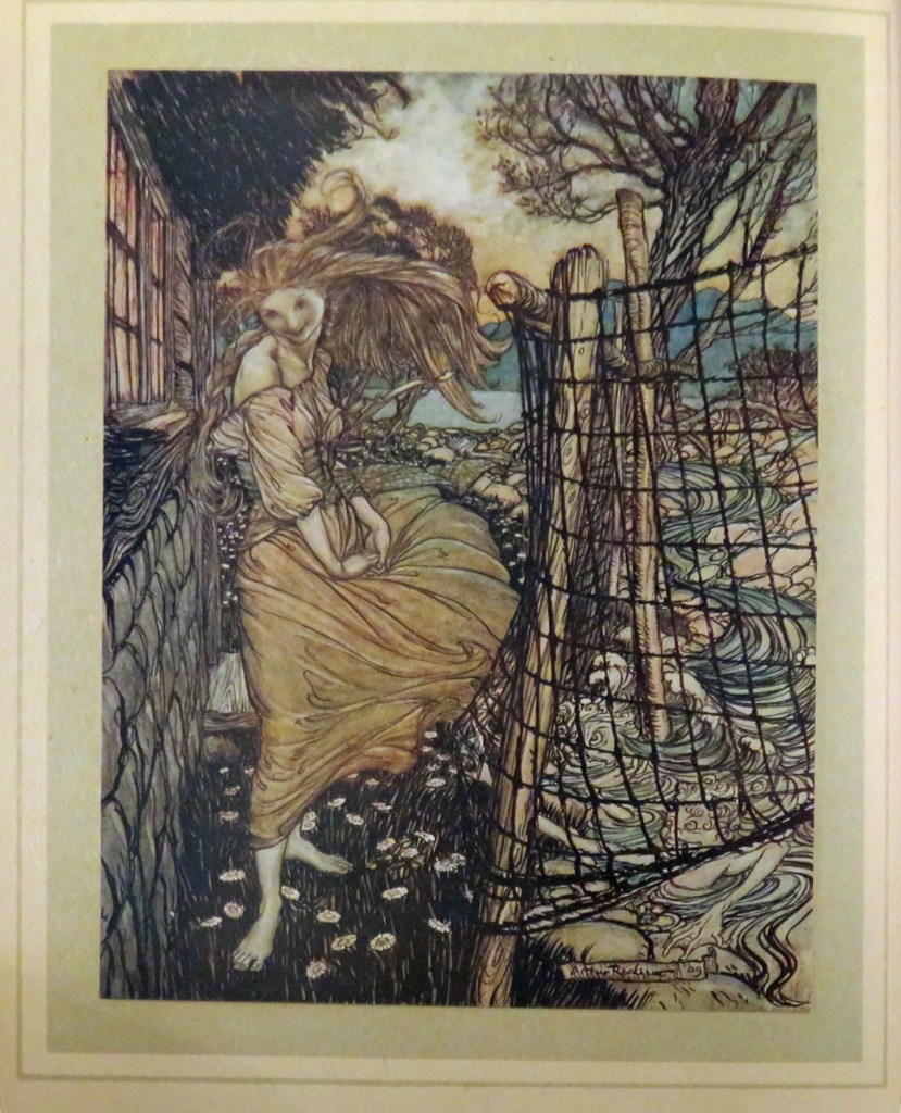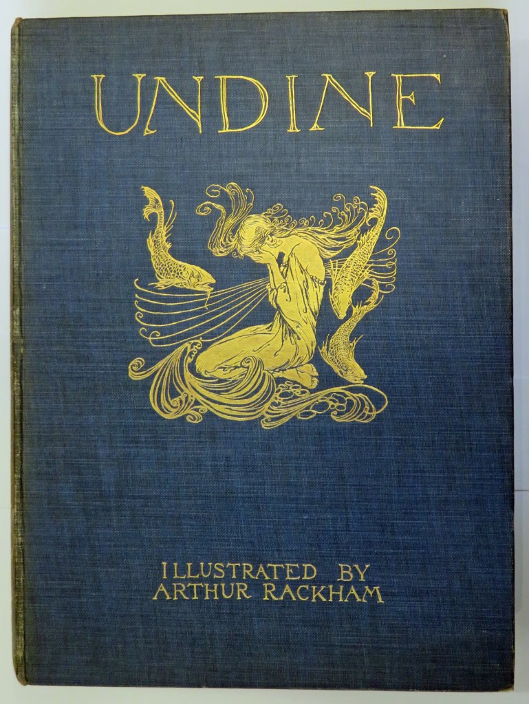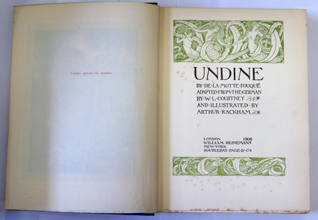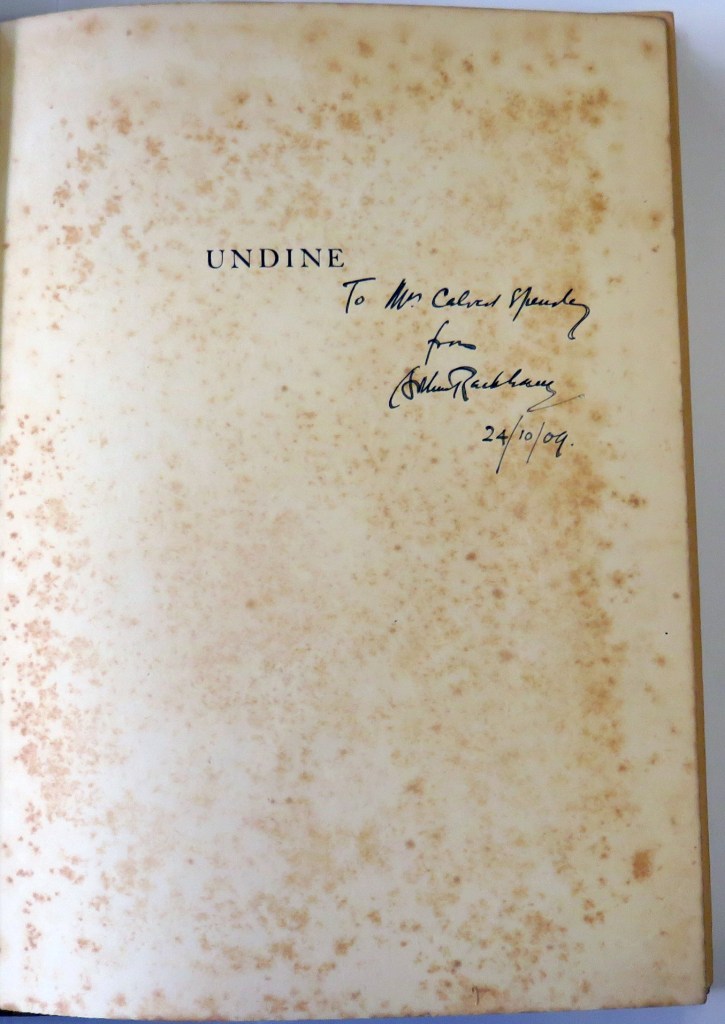 First edition of Undine by De La Motte Fougue, adapted from the German by W. L. Courtney, 1909. Hardback clothbound with gilt tooled title and pictorial vignette to cover and to spine. Top page edges green. Pictorial endpapers. Contains Ex Libris Calvert & Eleanor Spensley bookplate to verso of ffep. Inscribed to half title page ‘To Mr Calvert Spensley / from / Arthur Rackham / 24/10/09’. Full colour tipped in illustrated frontispiece with tissue guard. Printed quote to verso of tissue guard facing the title page. Pictorial decorative border to title page. Additional fourteen colour tipped in illustrations with tissue guard, and text illustrations to head chapters. Light shelf wear to edges and spine a little faded/discoloured. Endpapers and prelims are moderately to heavily spotted. Pages clean and bright despite a little light spotting throughout. Binding nice and tight. 136 pp.