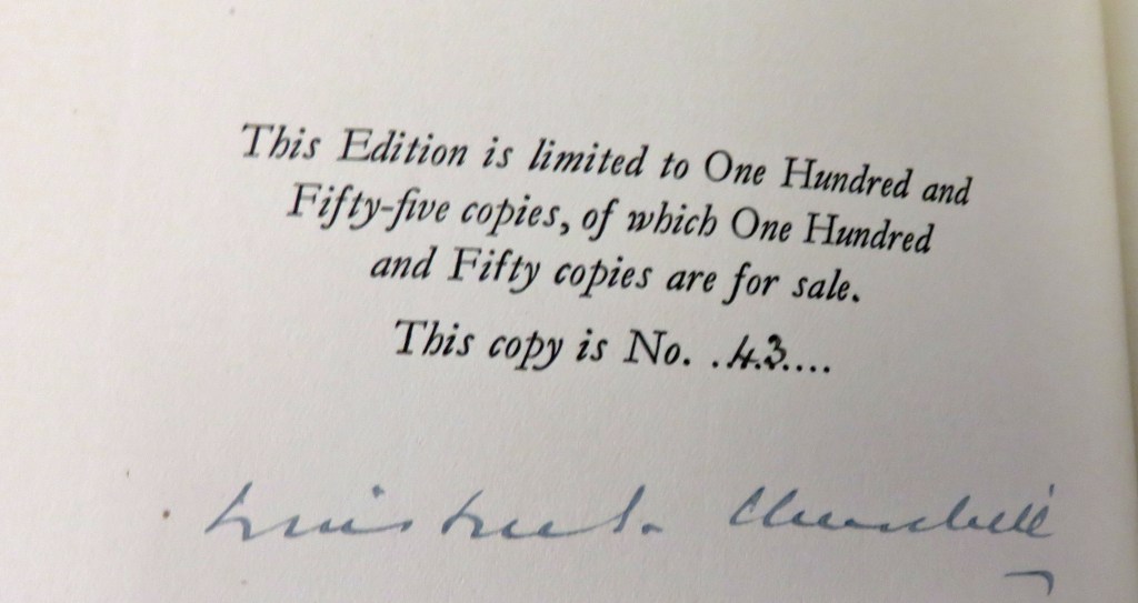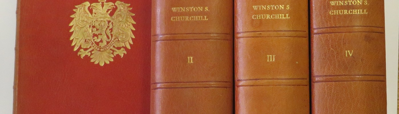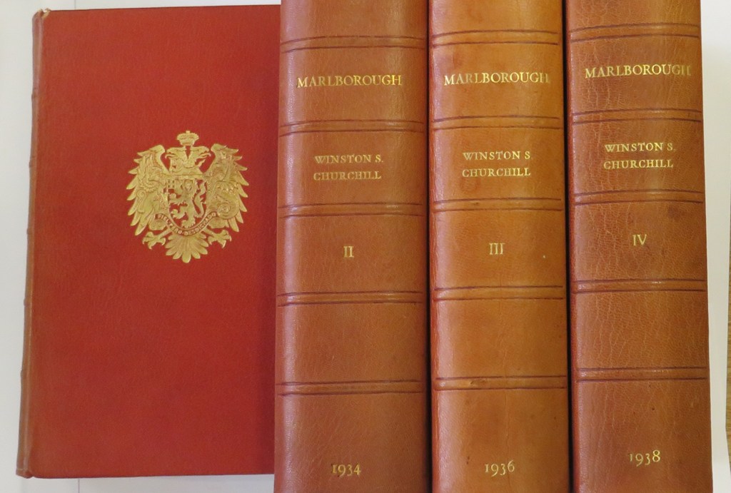 Beautiful limited edition set of just 155 copies, of which this is number 43 signed by Sir Winston Churchill. Excellent deluxe binding by Leighton Straker in full orange morocco with raised bands and gilt titles to the spine, and gilt Marlborough family coats of arms to the front covers. Spines a little faded, and a couple of light marks to the boards otherwise a lovely set. Marbled endpapers. A touch of foxing otherwise contents clean and bright, binding tight. Original booksellers receipt from Cornish and Barber booksellers in 1933 – the year of publication – loosely inserted. Bindings tight. The only signed limited trade edition of Churchills works and one of only two sets to be produced in leather. A very desirable set.