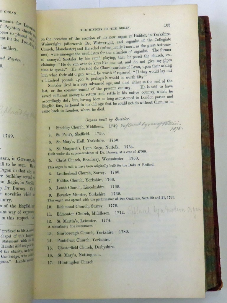 First edition 1855. Hardback half leather with red cloth boards and gilt tooled border. Five raised bands to spine with gilt tooled title and decoration. All edge marbling to pages. Marbled endpapers. Portrait of author Edward J. Hopkins as well as a letter in his hand to previous owner have been tipped in to plain endpapers. Fold out frontispiece of plan of an organ. Neat inscription to title page. Illustrations and printed sheet music throughout. Moderate shelf wear to edges and scuffing to raised bands. Rubbing to cover. Prelims lightly toned and foxed. Tipped in letter a little toned with a few spotting marks. Fold out plan intact and complete, with some splitting to folds. Pages clean if a little toned to the edges with occasional foxing. Some neat pencil annotations occasionally throughout. Binding nice and tight. A smart book, special because of complete fold out plan as well as the signed letter. Overall very good condition. 597 pp.