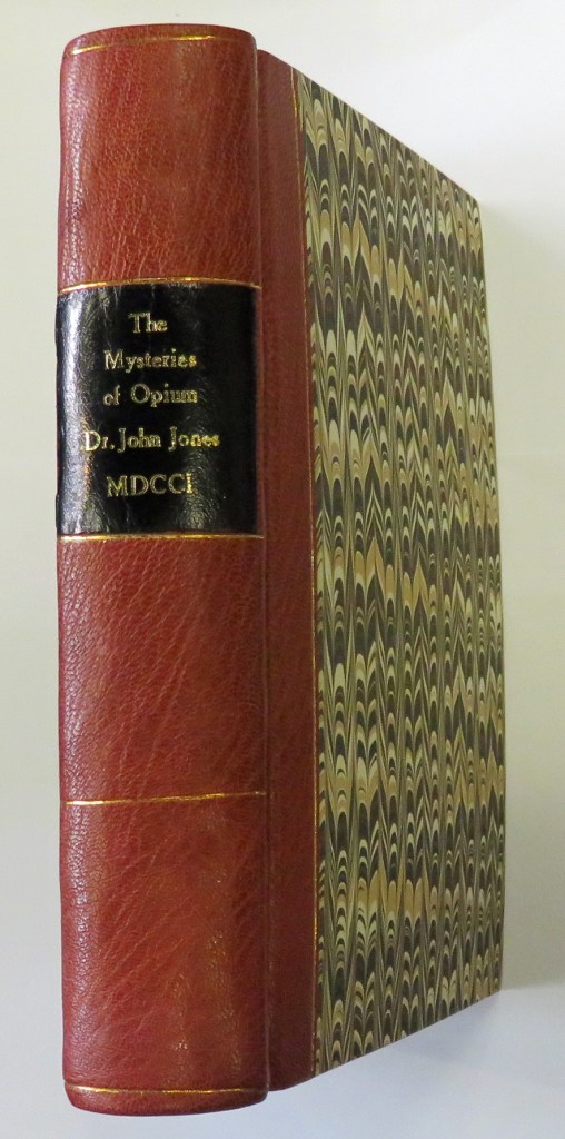Rebound by Diane Beedle bookbinders in a beautiful half leather with vellum tips and marbled paper covered boards. Black label band with gilt titles to the spine. Top edge red. Housed in a custom made black buckram clamshell box with label band and gilt titles to the spine. New endpapers and prelims. Previous owners hand written page of notes tipped in to the rear. Professional paper restoration to a handful of pages, some browning to the bottom edge otherwise contents clean. Complete with folding table of doses of the best and safest opiates in very good condition. A scarce volume. 371pp.