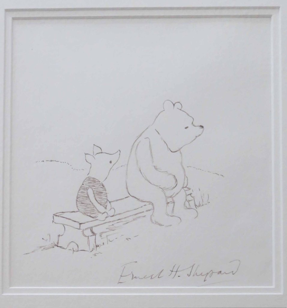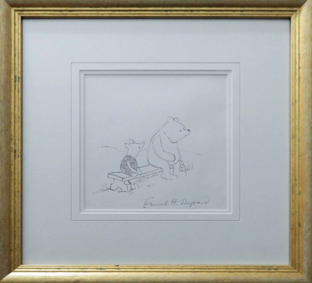 Stunning original pen and ink sketch by the original iconic illustrator of the Pooh books E.H. Shepard. Drawing features best friends Pooh and Piglet from the A.A.Milne Winnie-the-Pooh series, sat side by side on a bench. Signed in full ‘Ernest H. Shepard’. Mounted and framed. Drawing measures 174mm by 182mm, within frame 380mm by 385mm. A beautiful item in excellent clean bright condition, free from any foxing or creasing. Drawings by Shepard of his two most iconic characters are amongst the most desirable of his works, particularly so with a full signature as opposed to the commonly abbreviated ‘E.H.S.’. A truly exemplary example, would enhance any serious E. H. Shepard or A. A. Milne collection.
