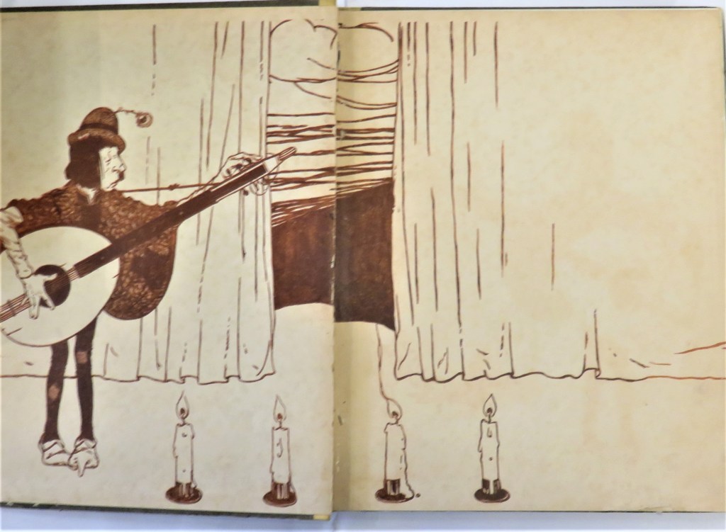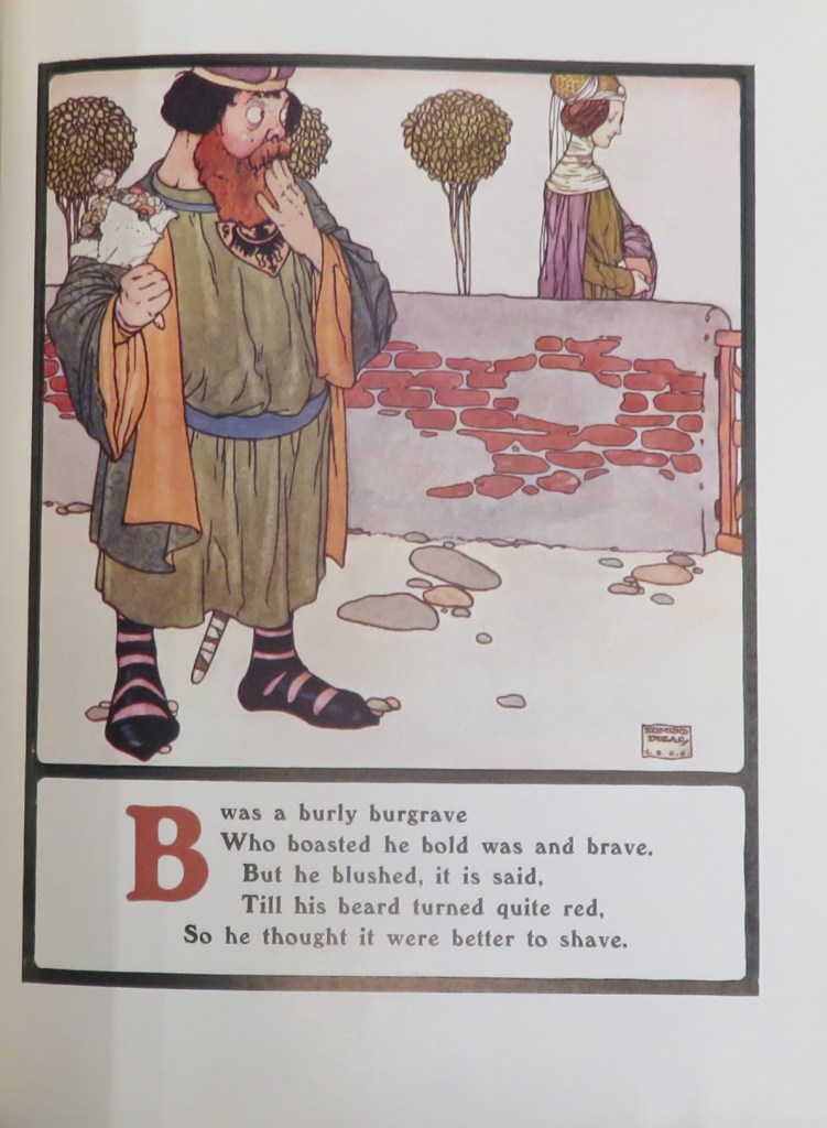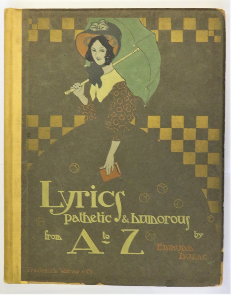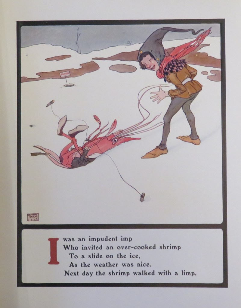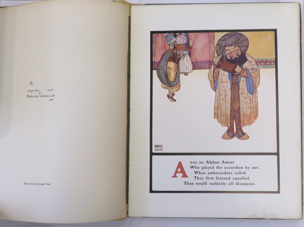 First edition 1908 hardback clothbound with printed pictorial boards. Pictorial endpapers. Pictorial title page. Every other page has a full colour illustration with framed verse below. A little chipping to edges of boards. Cracking to gutter and toning to endpapers. A small stain to bottom right of pages, only visible on the title page and first poem, however visible on all page edges. Some pages are a little loose. Pages are clean and bright and colours are vivid. Overall good+ condition. Unpaginated, approx. 48 pp. Beautiful book with quirky illustrations, would make a fabulous gift!